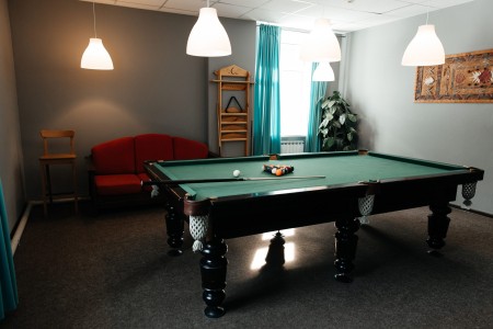 Бильярдный стол с американским пулом находится на первом этаже отеля и уже включён в стоимость проживания. Доступен для игры 24/7 без предварительной записи.